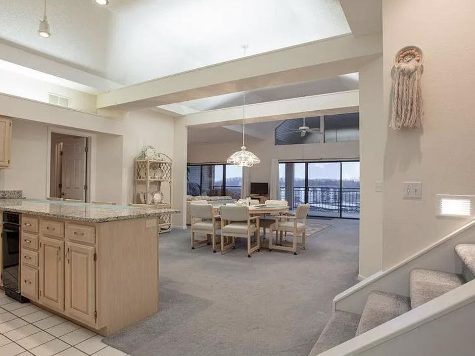 Stunning top-floor, 3-bedroom, 3.5-bath lakefront penthouse condo at The Falls Complex in Lake Ozark, MO! This spacious unit boasts almost 2,500 sq ft and offers breathtaking panoramic views of Mile Marker 2 from an extra-large covered deck. The two-level layout provides an abundance of living and storage space, a rare find here at the lake. Features include an open floor plan, split bedroom design, walk-in closets, a wet bar, large kitchen with granite countertops, and a sizable bar area. The condo also offers walk-in showers, high ceilings, two en-suites, a comfortable workshop room, and numerous windows for natural light. The Falls Complex's amenities, including two swimming pools, a tennis court, a playground, and a clubhouse. Enjoy lake life at its absolute finest! 10x28 boat slip!