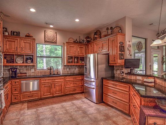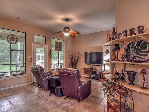 Unique 3 bedroom home located on nearly 3 ACRES in Montgomery Trace. Open floor plan through dining, kitchen and living room. Large kitchen with granite counters, custom cabinets, tons of storage and a breakfast bar. Spacious master suite with french doors leading to backyard. Master suite features separate shower and tub, separate vanities, and a walk-in closet. 2nd & 3rd bedrooms located on opposite end of house from master bedroom. The screened in back porch is perfect for summer time in Texas. This property offers total privacy as it is surrounded by trees.