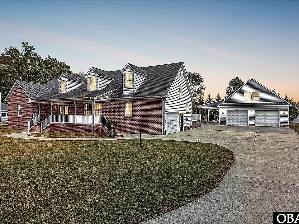 At the heart of this home lies a generously sized kitchen that is sure to impress any culinary enthusiast. Featuring a central island with a brand-new cooktop, stunning granite countertops, and custom cabinetry, this kitchen is both functional and stylish. The eat-in area, complete with built-in bookshelves, offers a cozy spot for casual meals, while the formal dining area is perfect for hosting dinner parties and family gatherings. The main level showcases luxurious LVP flooring throughout, offering both durability and elegance, while the upper level boasts brand-new carpeting for added comfort. The thoughtfully designed floor plan centers around a main-level primary suite, providing a serene retreat. Upstairs, you’ll find two additional suites, making this home perfect for guests or multigenerational living. For added versatility, the property features a generous Finished Room Over the Garage (FROG), which can easily be transformed into a home theater, gym, office, or playroom—tailoring it to your lifestyle needs. Storage and workspace are abundant with a detached garage that offers 1,300 square feet on the main level, ideal for hobbies, storage, or a workshop. Above this, a 533 square foot studio awaits, complete with a full bath and kitchenette—perfect for guests, potential rental income, or a private office space.The property is designed with your outdoor dreams in mind, as the septic system is conveniently located in the front yard, allowing for a spacious backyard that is perfect for summer gatherings and relaxation. With nearly 3,000 square feet of living space in the main home, there is ample room for everyone to enjoy. This residence is strategically situated just two miles from the Virginia border, providing easy access to local shops, restaurants, and vibrant farm markets. Additionally, the stunning Outer Banks are only about a 55-minute drive away, making weekend getaways a breeze.