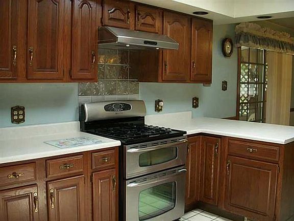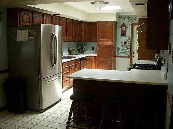 Spacious & updated on Huge Lot! Kitchen includes stainless steel appliances...dishwasher, refrigerator, stove and ceramic tile flooring with skylights! Beautiful private extra large covered back porch overlooking lush green yard & backing on the woods w/ fenced level yard & fire pit. Main level with full updated bathroom & new walk in jet spray tub, beautiful vanity, recessed light fixtures & hardwood flooring. Wood burning fireplace in Living room.2/garage/work shop/barn