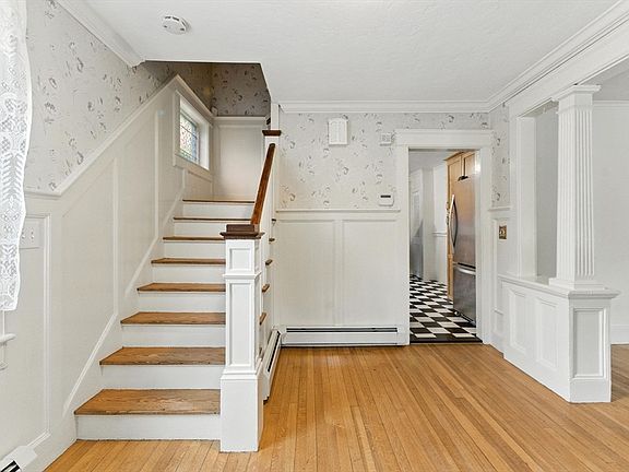 OPPORTUNITY KNOCKS... Don’t miss your chance to own an updated single family full of character & versatility. A foyer with classic columns welcomes you, setting a warm & inviting tone. This home features hardwood floors, an eat-in kitchen w/ granite counters & a dining room w/ a built-in cabinet & wainscoting. French doors open to a family room with vaulted ceilings and access to a deck overlooking the rear yard. As you head upstairs, a stained glass window brings a bit of color and charm on the way to three bedrooms, a full bath, and a walk-up attic ready for your ideas. The basement has the laundry area & basic finished space ready for hobbies, storage, or a rec room. Updates include baseboard heat, 2017 Boiler and mostly newer Harvey windows (2022). A welcoming farmer’s porch adds curb appeal. Whether you’re starting out, downsizing, or somewhere in between, this home offers something special for you...