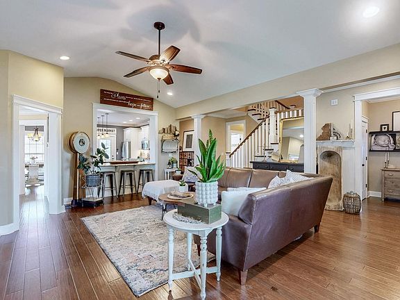 Stone fire pitLarge walk-in closetCovered back porchOpen-concept layoutLarge covered front porchSpacious bonus roomEngineered hardwood floors