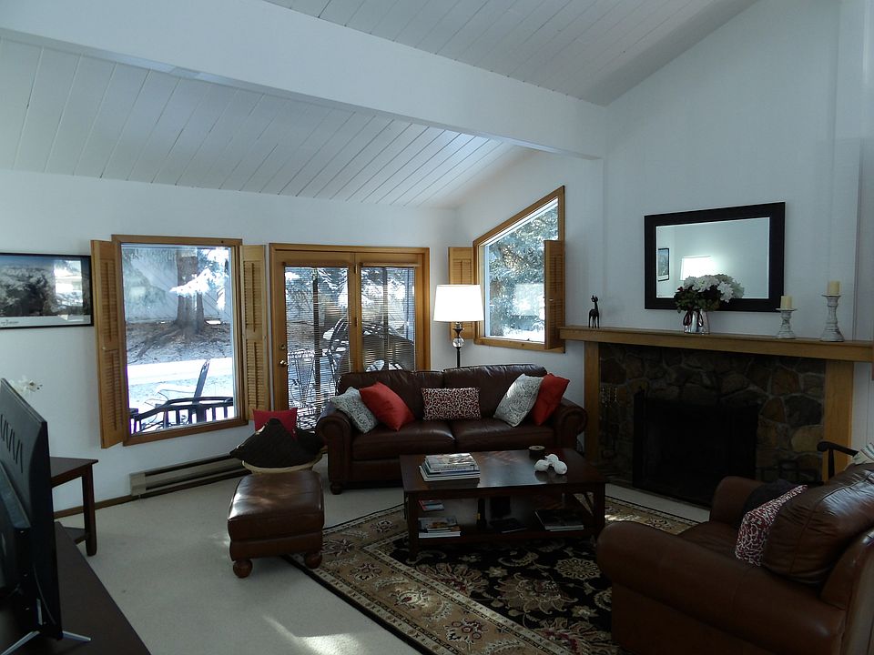 Enter down a paver walkway and into the home at a stone entryway and then onto a carpeted hallway that leads to the spacious living/dining area with vaulted ceilings, a wood-burning fireplace, comfy leather furnishings, and multiple French doors to the wrap-around deck outside. The dining area has seating for 6 and blends to a sitting area by one side of the kitchen and breakfast bar seating for 3 at the other side of the kitchen. The tile-floored kitchen is simple and functional with plenty of counter space and all appliances, including a glass cook-top stove.