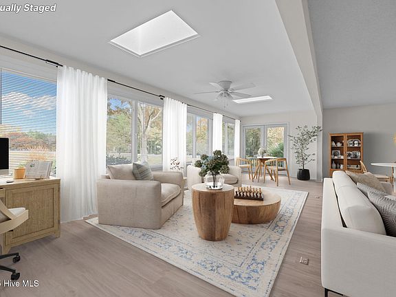 Inviting open floor plan featuring a light-filled Carolina room that overlooks the water-- dining and living room with a cozy fireplace, and kitchen with ample cabinetry and counter space. The primary suite boasts lake views and an ensuite bath for added privacy and comfort. Two additional bedrooms offer flexibility for guests or a home office.
