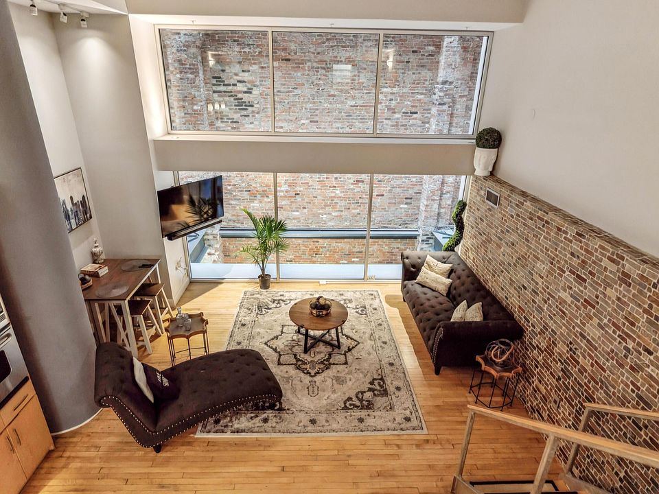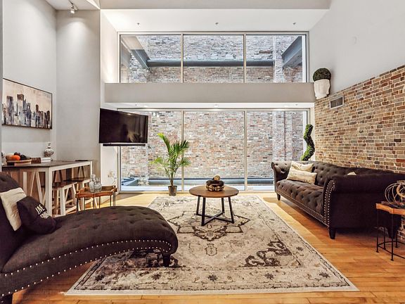 This impressive two-story unit showcases soaring ceilings, exposed brick walls, and an open mezzanine view that fills the home with light and character. The main level features a spacious living and dining area with dramatic floor-to-ceiling windows overlooking the atrium, complemented by warm hardwood flooring and industrial architectural details.