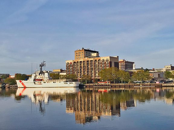 Experience luxury living in the heart of Downtown Wilmington's Historic District with this fully furnished, upscale condo. Perched on the 8th floor, this unit boasts breathtaking panoramic views of the Cape Fear River. The building features two dedicated elevators, a secure entrance, and private parking for added convenience and peace of mind.
