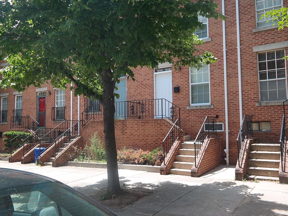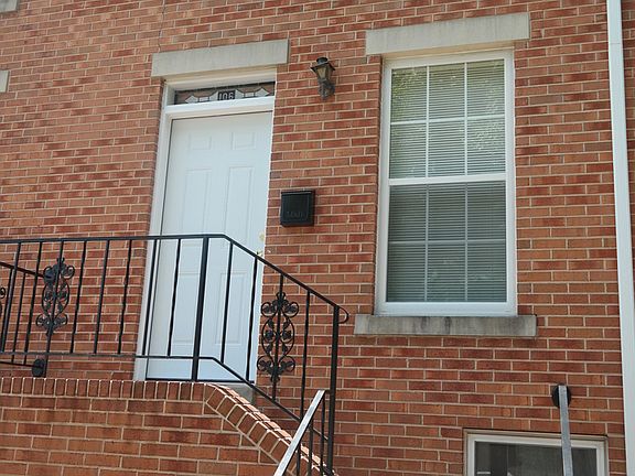 The exterior of the property showcases traditional Baltimore rowhome architecture with a brick facade, front stoop entry, and street-facing windows that maintain the character of the historic neighborhood.