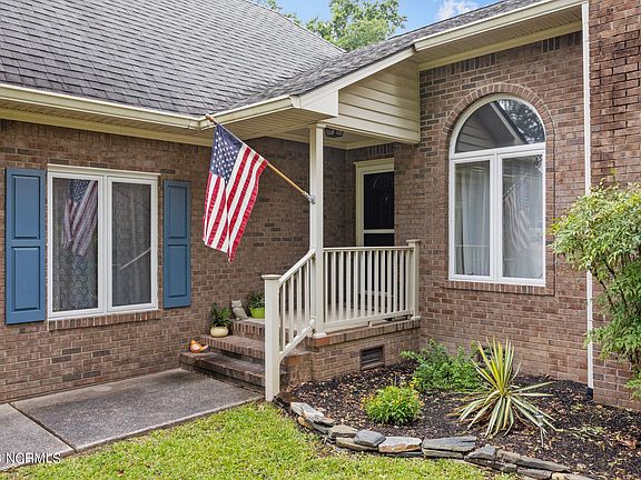 Welcome to this well-maintained brick home in River Bend. Details do make a difference inside with the hardwood floors throughout the living room, and dining room and two guest rooms. So many light-filled spaces to gather with friends and family-around the fireplace in this spacious living room, for meals in the dining room and for relaxation in the Carolina room with generous windows and LVP flooring. Mealtime is easy with plenty of workspace on generous granite counters and a center island with double sink. Kitchen has bountiful storage, gas stove and a beverage cooler. Rejuvenate in your spacious primary bath with double vanity and tiled step-in shower. Owners appreciate their privacy with split bedroom plan. Unwind in your lush backyard sitting on the large composite deck overlooking partially fenced area. Other special features of this property include a 4th guest room with its own full bathroom, whole house fan, and a well for the outside spigots, 16 x 12 storage with lights and electricity. Home is situated on a half-acre corner lot and a cul-du-sac street in a community just a few minutes from downtown New Bern and a short drive to the beaches. Amenities available include golf course, community pool, dog park, playground and restaurants. Irrigation system is present but not used by current owners.