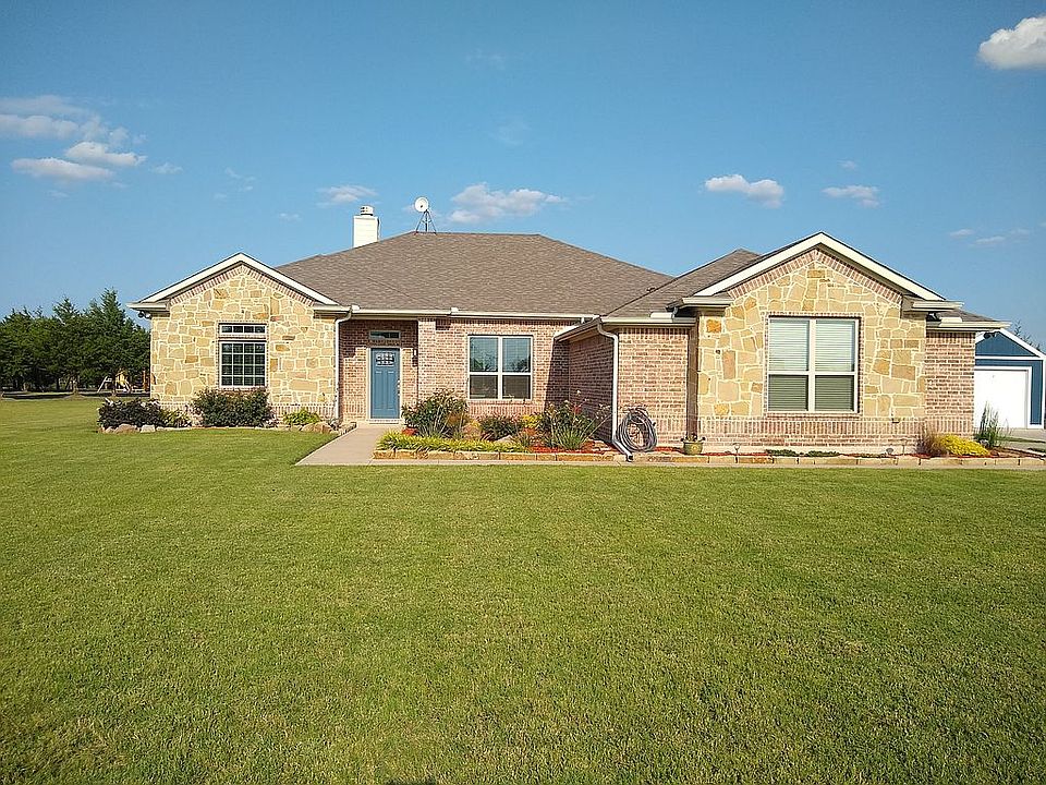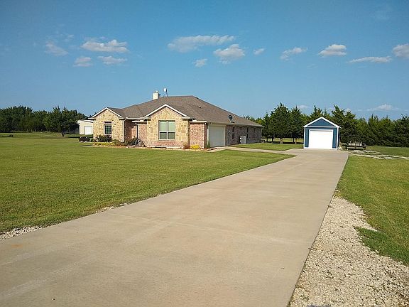 Enjoy country living and small town charm, only 20 minutes from downtown McKinney. 4 Bedrooms 3 Full Baths on 1.7 acre with open concept living. 4th bedroom would make a great home office. Includes extra large master with sitting area, his and her closets, hard to find second master, granite countertops, and wood burning fireplace. Special upgrades include shiplap accent walls, built-in cabinets and shelving in living room, custom window trim, dual shower heads in master bath, and ceiling fans and mounted TV on back patio. 12x24 workshop has electricity and both front and rear 8-ft garage doors. Numerous wall mounted cabinets provide plenty of extra storage in the attached garage. Sprinkler system.
