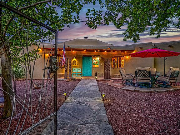 Welcome to the very essence of a custom-built traditional Santa Fe Style home privately nestled on almost an acre! Totally fenced with new latilla fencing and electronic gates. PRIVACY galore! Quality craftsmanship shows in this builder's model/Spec home that boasts everything that brings you to Corrales, the safest city in NM! You immediately feel welcomed entering the beautiful front fenced courtyard with artistic custom gate. Beautiful posts/latilla ceiling in great room (18.7x46.7) with a one-of-a-kind stunning kiva fireplace and nichos. Custom kitchen and closet cabinetry. Twisted Rope Post Portal back patio extends almost the entire length of the house with amazing mountain views and an outdoor kiva fireplace for those perfect entertaining evenings.