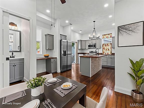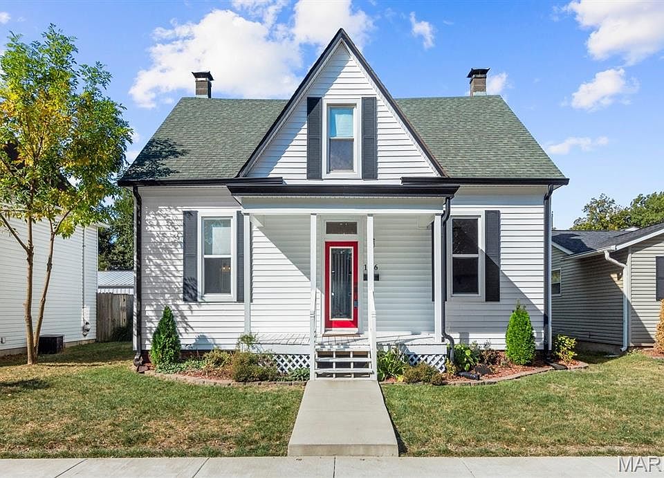 106 S. Vine is a charming 4 bedroom, 2.5 bath home with fenced in back yard, and is located in the heart of Freeburg! This adorable home is tastefully updated blending historic charm and character with modern updates. Beautiful refinished hardwood floors and updated lighting can be found throughout. The eat-in kitchen overlooks a fenced-in back yard. Kitchen updates include new cabinetry, a convenient center island, workstation for coffee bar or built-in desk area, beautiful butcher block counters, and a stunning stainless-steel appliance package. The living room has a electric fireplace for additional heat and ambiance on those chilly evenings. The main floor primary bedroom has a sizable bathroom with a walk-in shower that won't disappoint. A convenient main floor stackable washer and dryer are located in the primary closet stay. Upstairs you will find three additional bedrooms, a full bathroom with tub/shower combo, and above average storage space. The unfinished basement provides a lot of open space for additional storage needs. A second laundry area could be added as well. Move-in and celebrate the upcoming holiday season in your new home!