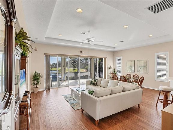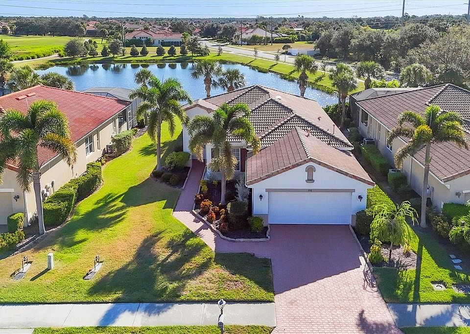 DON'T WAIT TO SEE THIS GORGEOUS HOME! Perfect home for snowbirds and down sizing primary home owners alike, this one fits just right. FURNISHINGS NEGOTIABLE SEPARATELY. Open floor plan with luxury vinyl floors throughout living, dining, and kitchen space. Large tray ceiling with extra recessed lights strategically placed for light on those rainy afternoons. Beautiful kitchen with wood cabinets, Quartz counters, and new stainless steel appliances. Room to eat in kitchen or sit at the counter bar top. Sliding doors to lanai pocket letting the outside and inside blend into harmonious bliss. Huge covered lanai running 26 ft long updated with tile flooring. Serene Lake views with Eastern exposure. Sit outside and enjoy your morning brew of choice. Plantation shutters on all the windows. Separate den or office space. Master bedroom with en suite bath that offers dual sinks, walk in shower, and make up station all updated with Quartz counters, listello tiles in shower and niche, stone tile flooring in shower, built with glass block windows for lots of light while keeping total privacy. Guest bedroom and bath at opposite end of home for privacy. Spacious guest bedroom with UPDATED guest bath adjacent for convenience. Laundry room has wash sink and lots of cabinet storage. HURRICANE SHUTTERS FOR PEACE OF MIND. Not in Florida to view in person? Check out the 3D Walk through tour at https://my.matterport.com/show/?m=PzVxhAN3Ls1 Venetian Golf and River Club sits in an ideal location between Sarasota and Venice, close to all the various activities the Florida Lifestyle offers. Venice Downtown, Sarasota Downtown, multiple beaches including World Famous Siesta Key- voted one of the best beaches in the US. Kayaking, boating, fishing, and trail walks are just minutes away. Shopping, theatres, and restaurants-both casual and fine dining are right around the corner. And then sometimes you just want to stay at home- within the community that is. Venetian Golf offers everything you could want- Clubhouse, exercise room, tennis and pickleball courts, Resort style swimming pool and Tiki bar, Lap pool, and formal dining restaurant. Boardwalk nature walking trail through 70 acres of nature preserve park down to Myakka River. Lots of community activities and special event opportunities to meet your neighbors. Golf Membership is NOT mandatory but is available for the 18 hole Championship golf course. Come find your Florida Lifestyle today!!
