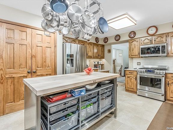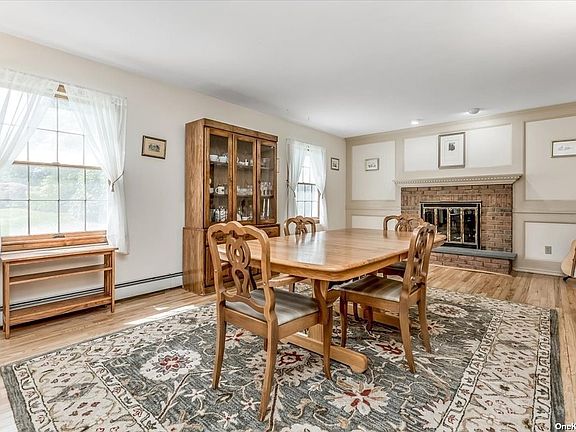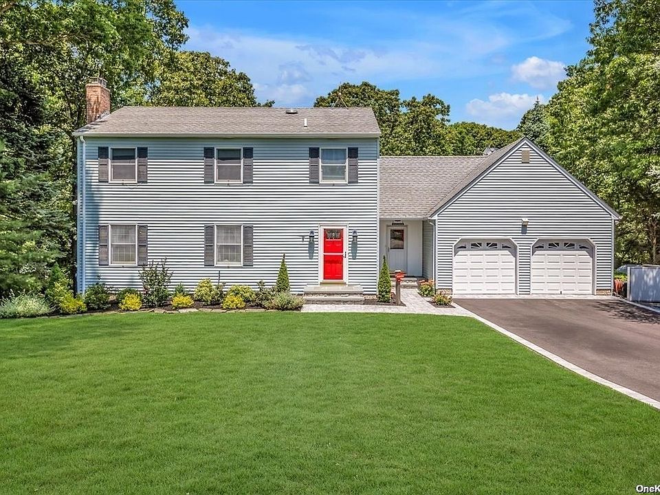 Resort style living in sought-after Westwood Acres, Aquebogue! Your perfect "staycation" home on the North Fork with beautiful freeform in ground pool, and huge yard bordering 100s of acres of development-rights-sold woodland with ponds and trails to explore. This spacious colonial with 3, possible 4 bedrooms, and 2.5 recenly renovated baths features a huge sunfilled family room with stone fireplace overlooking the pool and yard, newly refinished HW floors, renovated primary bath with radiant heat, and two large closets in owner's suite, well appointed kitchen and large deck for BBQing. There is an oversided 2 car garage attached with plenty of storage space above, and a full walkout basement with additional garage sized storage for yard tools and pool furniture. Natural gas heated! Close to vineyards, marinas, state and county parkland, beaches, restaurants, medical, and shopping. Easy accessto LIE.