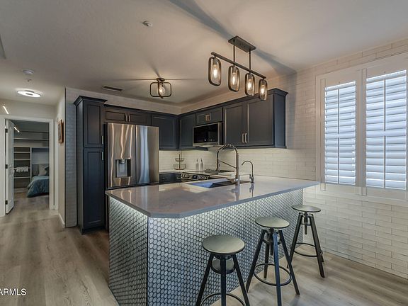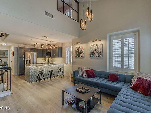 Welcome to refined living in this beautifully furnished home, luxuriously updated in April 2025. The kitchen dazzles with quartz countertops, sleek cabinetry, new sink and faucet, and high-end appliances. Engineered wood floors flow throughout, while both baths feature elegant tile and glass showers. Plantation shutters frame sunlit windows. The entry offers built-in storage and seating perfect for daily essentials. Enjoy an open-concept great room with modern furnishings, a breakfast bar, and a tucked-away coffee/wine nook. A guest bath and second bedroom complete the main level. Ascend the spiral staircase to your private luxury suite. All this, just blocks from premier dining, shopping, and entertainment. Community Pool. Arizona living at it's best!!