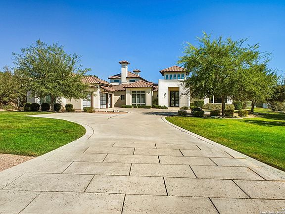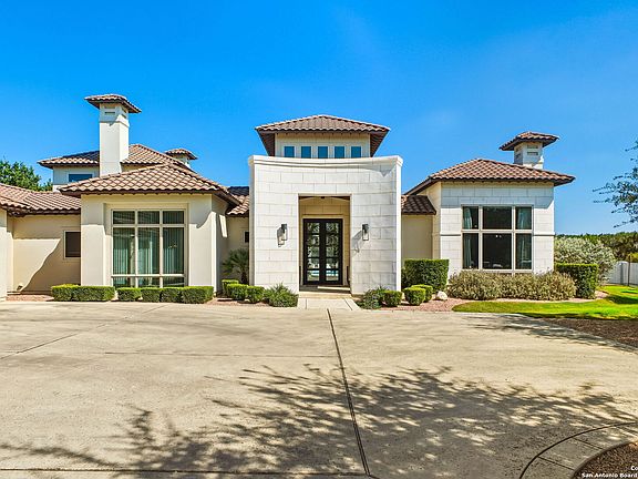 Welcome to this one-story Modern Transitional estate which embodies show stopping detail and sophistication in San Antonio's most prestigious gated communities-Huntington at Shavano Park. This Paul Allen custom home is over 6400 sq/ft and features unsurpassed craftsmanship and design elements that showcase the open floor plan with walls of sliding glass doors that seamlessly integrate indoor and outdoor living. The chef's kitchen features top of the line appliances, an expansive custom island that flows into the living room with custom architectural/ceiling detail, a dramatic fireplace, large separate breakfast and dining areas and a full walk up bar. The interior is detailed with oak floors, smoothly finished walls and designer light fixtures. The oversized master retreat boasts a luxurious spa-like bathroom and a massive walk-in closet with extensive custom cabinetry/built-ins and outdoor access. Impeccable craftsmanship prevails with four spacious guest bedrooms, all with en-suite bathrooms. Additional features include a large office & an oversized game room with a wet bar and patio access leading out to a large covered patio with a full outdoor kitchen. The resort style outdoor area features an oversized patio, a large spacious yard that offers full privacy backing up to a greenbelt, custom pool/spa and a sports court. An oversized 3-car garage offers ample parking and storage. This property must be experienced in person to be able to take in all it has to offer. This desired location offers a private retreat while keeping you close to premier dining, shopping, and entertainment, with effortless access to Loop 1604 and I-10.