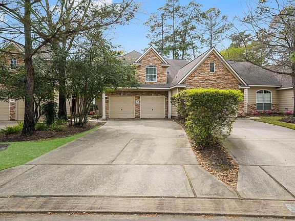 Meticulously maintained townhome in the sought after Village of Alden Bridge! Inviting entry with 2 story ceilings and winding staircase open to living room with floor to ceiling windows and gas log fireplace. Kitchen features breakfast bar, island and ample cabinet space with access to both breakfast and dining room. Stroll upstairs to the spacious game room, secondary bedrooms and master suite with vaulted ceiling, and ensuite with dual sinks, garden tub and walk-in shower/closet. Utility room also located on second floor for convenience. Beautifully landscaped backyard with covered patio and flagstone pavers leading to a secondary sitting area for relaxation. Quiet and serene neighborhood close to everything The Woodlands has to offer!