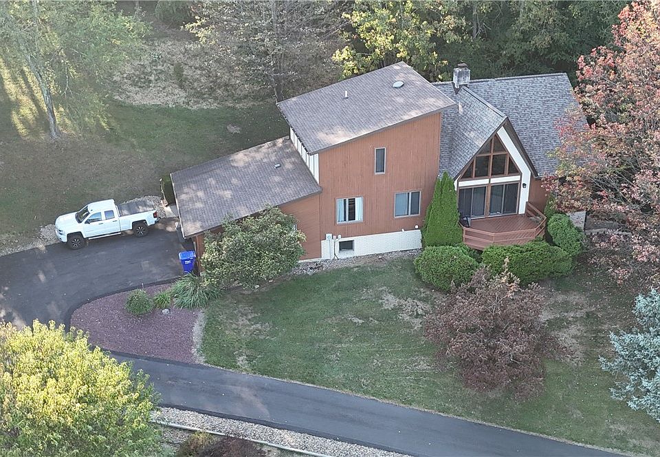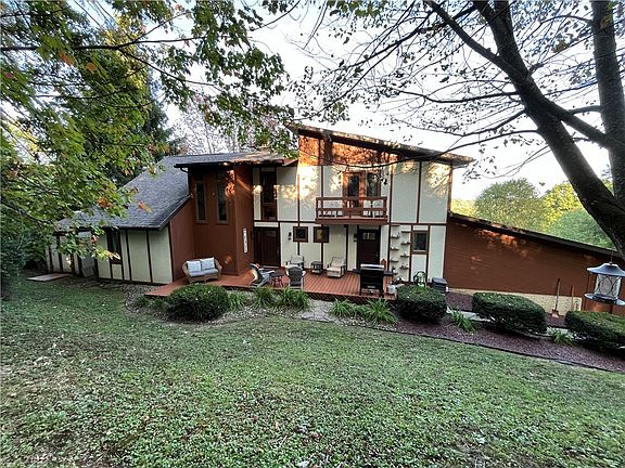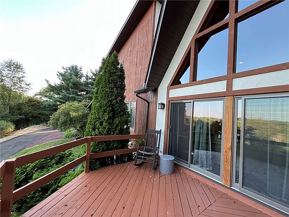 Chalet style home with open floor plan on private wooded lot. Attached two car garage and with newly paved driveway. Large kitchen with breakfast nook and coffee bar. Formal dining room is open to the great room that has a wood burning fireplace and large windows for natural light. Deck off the great room provides a view of the surrounding area. Main floor also has two bedrooms, full bath, laundry room, and a half bath. Beautiful wooden staircase leads to the second-floor walkway. This open walkway provides views of the great room below. Master suite with two walk-in closets and balcony that looks over the back of the property. Master bath includes two sinks, shower tub combination, and additional separate shower. Second floor also has additional large bedroom. The unfinished basement of the home provides amble storage and has plumbing for an additional bathroom. One year home warranty provided by seller at closing.