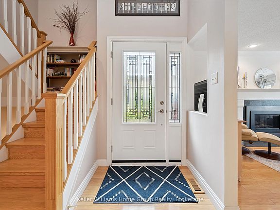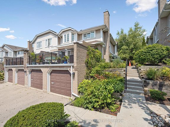 Bright, Spacious & Perfectly Located - Welcome to River Ridge Living in Guelphs North End. This beautifully updated condo offers the comfort of a freehold feel with the low-maintenance lifestyle of condo living all set in one of Guelphs most peaceful and amenity-rich communities. Inside, the sun-filled main level features gleaming hardwood floors and an inviting living room with a custom gas fireplace. The dining area, enhanced by full-length built-in cabinetry, is perfect for hosting or displaying your favorite pieces with style.The kitchen offers a clean, modern aesthetic with white cabinetry, a breakfast peninsula, built-in microwave, and ample storage. Step outside to your oversized private terrace, a true extension of your living space, featuring two retractable awnings ideal for shaded afternoon lounging or summer evening BBQs.Upstairs, the spacious primary bedroom boasts hardwood flooring, a charming bay window, walk-in closet, and semi-ensuite access to the main bathroom. The finished basement expands your living options with a versatile rec room, dedicated office nook, 3-piece bathroom, laundry area, and direct access to the garage a practical bonus during wet weather. What truly sets this home apart is its access to River Ridges outstanding outdoor amenities: enjoy a refreshing swim in the private residents pool, challenge your friends to a game on the tennis or pickleball courts, or step outside your door to explore some of the city's most scenic riverside trails and parks, just minutes away. Close to Riverside Park, a historic golf course, local shops, dining, and transit this is not just a home, its a lifestyle.