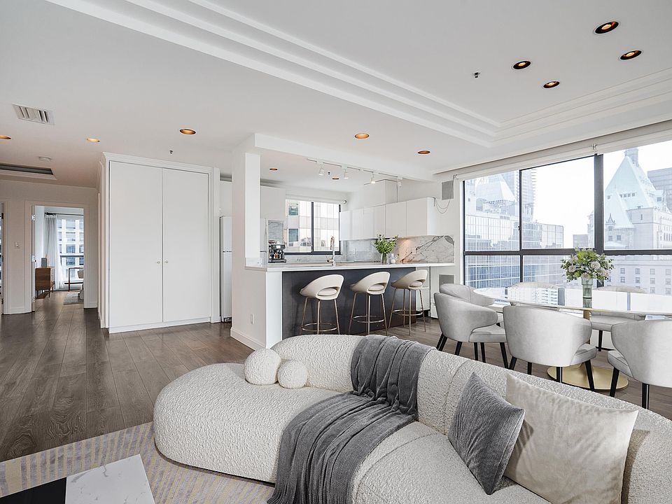Unprecedented Opportunity, Exceptional Views! Own this breathtaking 1,428 sq.ft. Penthouse, offering spectacular views of Downtown Vancouver & Robson Street, complete with private garage. The sophisticated open kitchen & living areas are perfect for entertaining, complemented by AC, the sumptuous principal bedroom features a walk-in closet with built-in vanity & beautiful ensuite. Located in The Carlyle, prestigious & meticulously maintained building on the coveted Alberni Street, be immersed in the heart of Vancouver’s luxury district. With finance & business hubs just steps away. This home offers access to a wealth of amenities, including indoor pool, fully equipped fitness center, & newly updated outdoor patio with outdoor kitchen, gathering area, private gazebos, & sunbathing spaces.