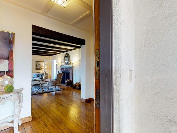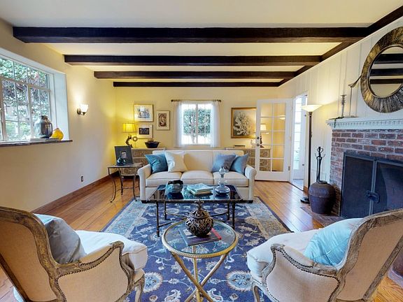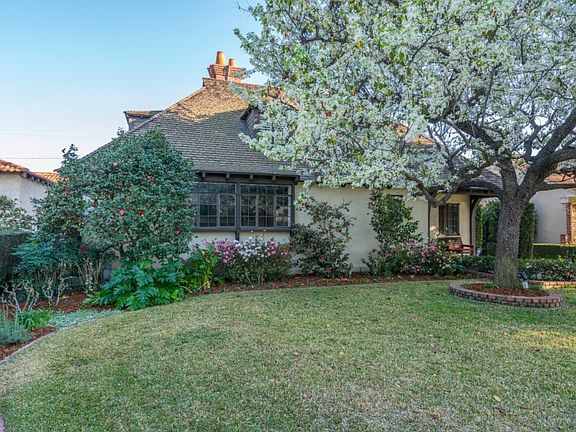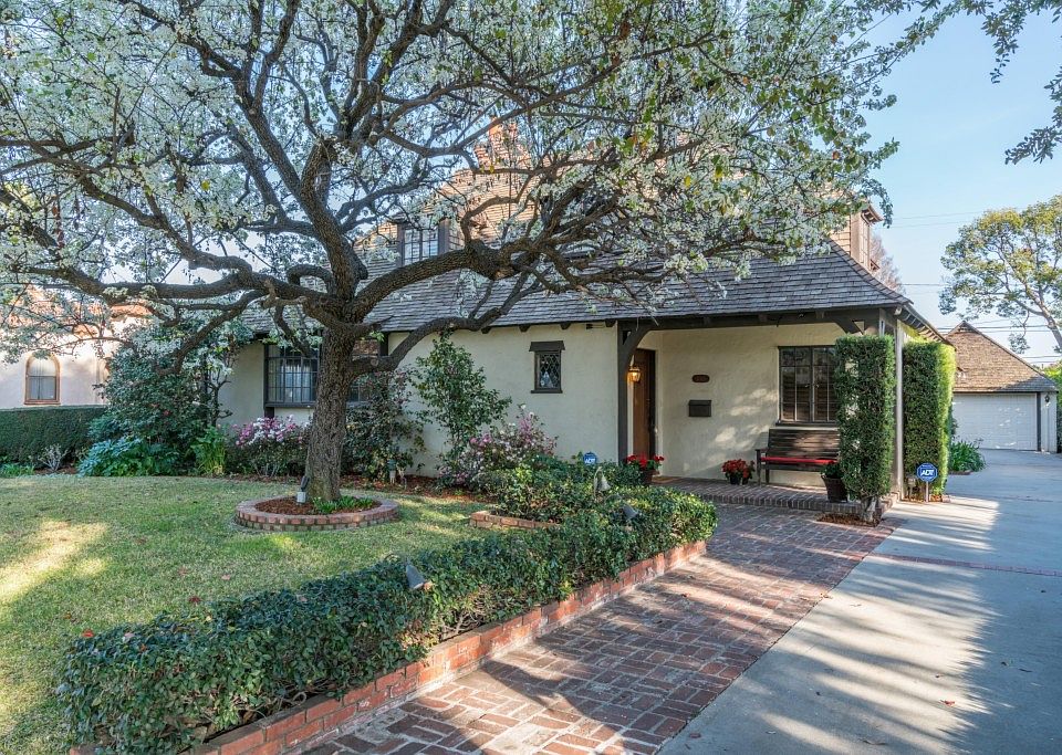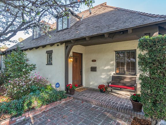 Charming French Normandy home with an additional 498 sf guest quarters. Rich architectural details including grooved oak wood floors, crown moldings, exposed wood beams & French doors. The formal entry leads into the living room with exposed beamed ceilings & fireplace with brick hearth. The formal dining room has a gas corner fireplace, crown moldings & French doors leading to the sunroom with brick floors. The gourmet kitchen features granite countertops, center island, Viking cooktop, Double ovens, Bosch dishwasher, prep sink, built-in wine refrigerator, breakfast bar & walk-in pantry. This opens to the family room with built-in custom entertainment center with door to private office with desk & shelving. There is one bedroom en-suite with built-ins, & bath w/sep tub & shower. Powder room & laundry completes the first level. The second level has a master suite and bath with dual sinks, large tiled shower, 2 additional bedrooms with ample closet space, wood floors under carpet, which share a full bath with tub & shower. The picturesque gardens feature a spacious patio, grassy lawn with lemon, fig, orange and avocado trees, automatic sprinklers, 2 car detached garage with workroom, and separate guest quarters with wood floors, built-in cabinets.