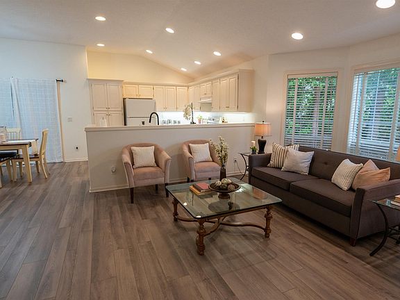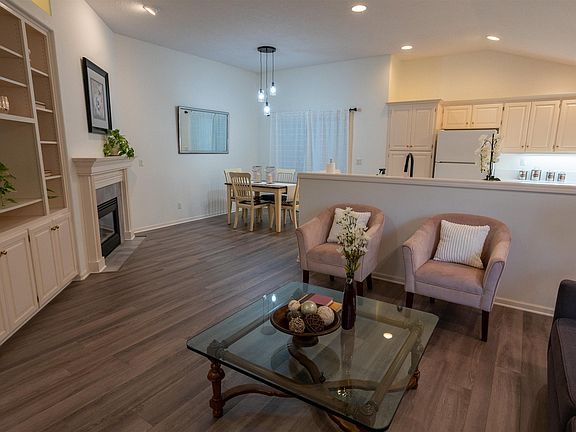 Meticulously maintained single level in Hidden Creek Estates. Sits on a quiet lot guarded by trees w/ private backyard & water fountain. New roof in 2022, new flooring & carpet throughout, new d/w & more. Large bedrooms & 2 full baths. Primary bedroom has en suite bathroom w/ adjoining walk-in closet. Open kitchen/living/dining w/vaulted ceiling, cozy gas fireplace, bay window & sliding door opens to covered back patio. Lots of storage. 0.5 miles to park & walking trails. 2.5 miles to I-5 & Keizer Station.