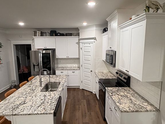 Step inside to an open-concept main floor with durable LVP flooring, a spacious living area, and a large kitchen equipped with granite countertops, stainless steel appliances, and plenty of cabinet space. Vaulted ceilings add an airy, welcoming feel throughout the main level.
