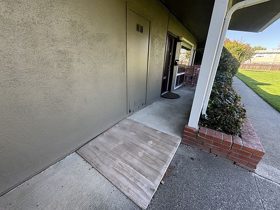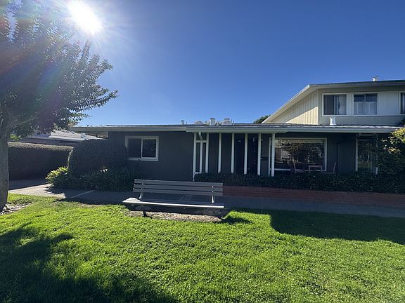 Enjoy a welcoming front porch with table and a large, landscaped back patio with pavers, a Meyer lemon tree, an orange tree, an irrigation system, patio furniture, and a large sun sail. This 3-bedroom, 2-bath ranch-style condo features a spacious kitchen with granite countertops, white cabinets, appliances, and LVP plank flooring. The home includes new bedroom LVP flooring, hardwood in the main living areas, and tile in the bathrooms. ADA features include a roll-in shower, front door ramp, push-out sliding door screens, and grab bars. Additional highlights include a large pantry in the dining area, a versatile extra room ideal for a sunroom or breakfast nook, ceiling fans, built-in bookshelves in two bedrooms, an en suite main bedroom, skylights in the hallway and bathroom, large picture window in living room, in-unit washer and dryer, and generous closet space throughout. All utilities are covered except for internet and cable tv. Community amenities include a pool and landscaped grounds. Conveniently located near shopping, transportation, hiking trails, Oleander Park, Kaiser Hospital, the YMCA, and within the Miller Creek School District.