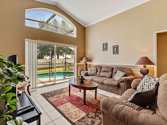 This stunning 4 bedroom 3 bath home located in the gated Solana Resort community is being offered fully furnished. The home features a split floor plan with a formal living room/dining room combination at the front of the home with vaulted ceilings in the kitchen and family room that open to the heated swimming pool that is fully screened and has lots of space for loungers, table and grill. The garage has also been transformed into a Game Room with a Pool table. This turn-key ready home is equipped with everything you need and is move-in ready. This home is zoned for short term rental, and a great investment choice for vacation rentals. This community has many recreational activities for you and your family to enjoy, including a community pool, volleyball, fitness center, sundry shop, mini golf and Tiki bar. Solana is located conveniently near Disney World and all the Orlando attractions.