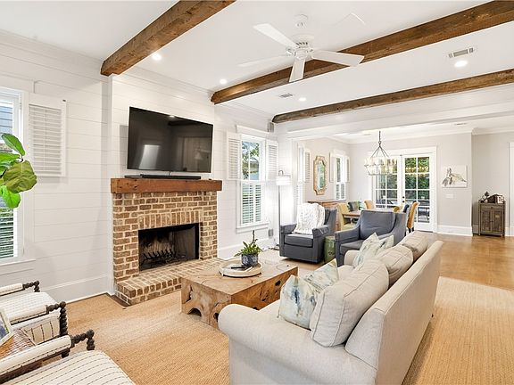 Experience refined Lowcountry elegance in this exceptional 4-bedroom, 4-bath coastal residence, offering a fully furnished 2,744 square feet of impeccably curated living space within the prestigious Village Oaks enclave. From the moment you arrive, the home exudes timeless sophistication with its board-and-batten façade, brick accents, and an inviting front porch framed by lush landscaping and welcoming rocking chairs—a signature nod to gracious Southern hospitality. Inside, every detail has been masterfully executed. Sun-drenched living spaces unfold under exposed wood beams and custom shiplap, anchored by a striking brick fireplace with a bespoke timber mantle. The open-concept design flows seamlessly into an elegant dining area and a gourmet kitchen, where premium finishes, generous workspace, and effortless functionality cater to both intimate evenings and elevated entertaining. Plantation shutters, designer lighting, and a serene neutral palette create an ambiance of understated luxury. Private suites are thoughtfully appointed, including a beautifully styled guest retreat with coastal-inspired details, ensuring comfort and privacy for every visitor. Each of the four baths offers a spa-like experience with refined fixtures and timeless finishes.Outdoor living is equally captivating. A screened porch invites quiet mornings and alfresco evenings, while the secluded courtyard—enhanced by tailored landscaping, bamboo privacy, and a charming fire pit—provides an intimate sanctuary for relaxation or sophisticated gatherings. Meandering garden pathways add a touch of enchantment to the grounds, extending the home’s sense of serenity. A rare offering in Village Oaks, this residence harmonizes architectural beauty, modern comfort, and resort-style ambience—delivering the pinnacle of luxury coastal living.