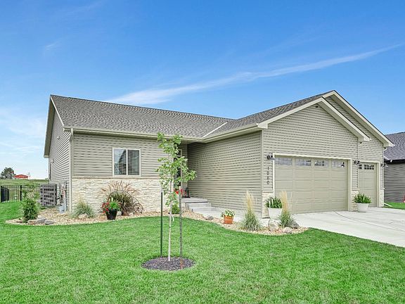 This stunning ranch-style home combines sleek design, functional living, and plenty of charm. Featuring 2 spacious bedrooms, 2 bathrooms, and over 1,500 sq. ft. on the main level, this property is move-in ready with thoughtful upgrades throughout. The basement is already framed and roughed in for bathroom fixtures, giving you the perfect head start to add even more living space in the future. Step inside to soaring ceilings, an open-concept living room with a cozy fireplace, and a kitchen that will impress any home chef-complete with white cabinetry, subway tile backsplash, stainless steel appliances, and a large island with seating. The split-bedroom layout offers privacy, while the primary suite includes a walk-in closet and spa-like bath. Enjoy convenient main-floor laundry with built-in drop zone, plus an oversized 3-stall garage that doubles as a workshop. Outside, you'll love the landscaped yard, spacious patio, and open views. Located in a growing neighborhood just minutes from Lincoln's conveniences, this home is the perfect blend of comfort and style. Listed at $449,500 - Schedule your showing today before it's gone!