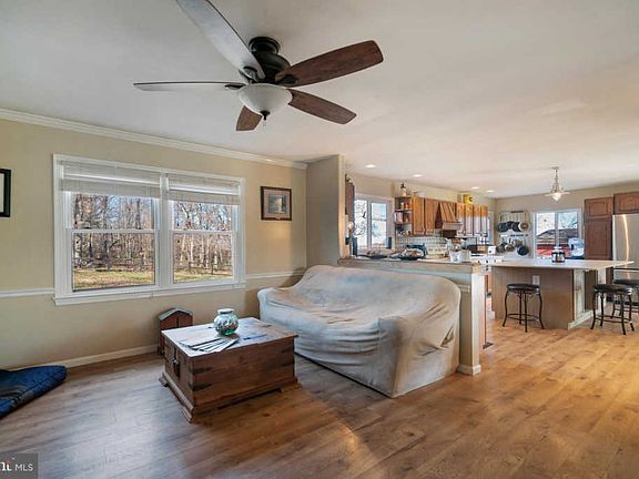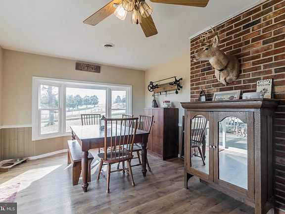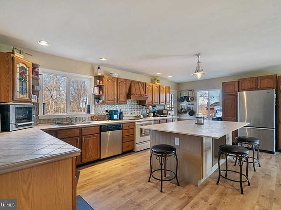 Here is the country home of your dreams! This beautiful three-bedroom ranch sits on three wooded rural acres, and even includes a large chicken coop and two pig pens! The open floor plan is bright and airy, with new flooring throughout the first floor (including the master bedroom), and plenty of natural light. A spacious eat-in kitchen features tiled countertops, stainless steel appliances, and a large central island. The finished basement has a wood-burning fireplace, a wood stove that provides heat to the whole house, and full laundry room with washer, dryer, and cabinets. Three comfortable bedrooms are on the main floor, each with ceiling fan, as well as an office. Outside, a wood deck overlooks an amazing in-ground pool, with a great view of the mountains in the distance. The deck comes prewired with its own breaker box ~ perfect for installing a hot tub. Two separate driveways feature river-washed gravel. A giant barn with concrete floor is the perfect place to store an RV or boat, safe from the elements, and is available to build out for horse stalls.