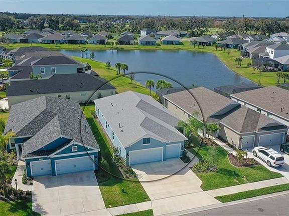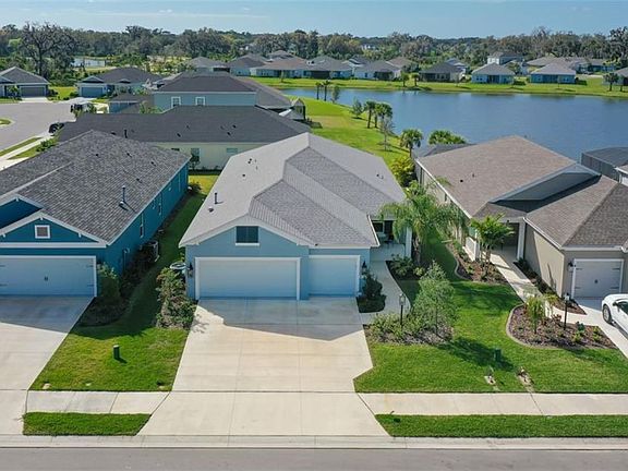 This charming 3-Bedroom, 2-Bath, Bonus Room, Mud Room plus 3 Car Garage home must be seen to be appreciated (nice Laundry Room too). The Meadow Brook floor plan gives you gorgeous lake views, a contemporary coastal color motif, and best of all, no wait time to build! The home has charm to spare starting with excellent curb appeal, a front porch, and inside- a completely open floor plan that includes a stunning kitchen with a large center island, designer pendant lights, white subway tile backsplash, stainless steel appliances that include a gas stove, walk-in pantry, and beautiful white cabinets. The GE appliances are under warranty until June 2024 and the Trane AC also has a warranty plan (appliances covered include the washer, gas dryer, dishwasher, refrigerator, microwave, gas range & garbage disposal). One of the guest bedrooms has a large walk-in closet and the Owner's Suite has TWO walk-in closets (both are BIG) plus a lovely Spa Bathroom that includes a double sink vanity and large walk-in shower. Tile is found in every room in the house with the exception of the guest bedrooms. The lanai has also been extended by 8', affording the owner even more space to entertain family and guests, as well as enjoy the wonderful lake views and spectacular Florida sunsets. The Meadow Brook home is included in the Neal Celebration Series that provides the owner with amazing features like the Smart Home Package. The Smart Home Package includes: Smart thermostat with Z-wave technology, Smart entry door deadbolt with Z-wave technology, Connected HD video doorbell, Smart hub to connect Z-wave devices, Structured wiring system including Cat6 phone/data and RG6 cable outlet. There is no doubt that Silverleaf is a community you will love to call home. There are so many amenities for you to enjoy, you may never want to leave! The community enjoys a recreation center with a fitness center, pool, and spa, playground, picnic shelter with grills, basketball court, 2 dog parks, walking trails as well as beautifully landscaped entry and streets. Quick access to I-75 as well as the new Fort Hammer Bridge connect you to Lakewood Ranch, Tampa, St. Pete, Bradenton, and Sarasota. Shopping can be found right down the street at the Ellenton Outlet Mall and restaurants are plentiful. Love to go boating? You are very close to the Ft. Hammer boat ramp. This home will not last long so hurry and schedule your private showing today! Please note- CDD fees are included in the taxes.