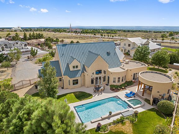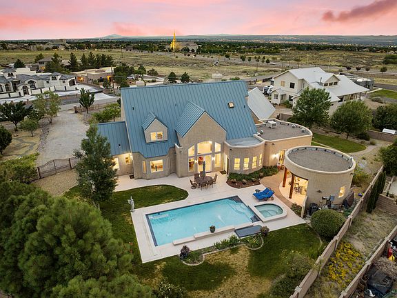 This stunning residence inspired by the architecture style of French Country. This lovely home overlooks .91 acre and magnificent panoramas of the Sandia Mountains and city lights to the West of picturesque Albuquerque, stretching as far as the eye can see. Its nearly acre encompass a wealth of luxurious amenities, including an expansive pool, hot tub, and fully equipped indoor chef's kitchen as well as an outdoor kitchen. The luxuriant pruned grounds are a worthy setting for the villa's dazzling interior. Featuring beamed ceilings and exquisite hand-crafted moldings, this home - which boasts over 4 bedrooms, a possible 5th bedroom and 5 bathrooms, with 4,600 sq. ft. of living space - faithfully reflects the elegance and grandeur so characteristic of superior old world French design.