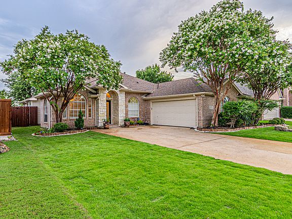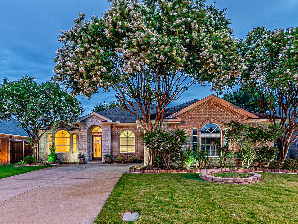 Discover this beautifully updated single-story home situated in desirable Frisco ISD. Once inside you'll be invited by an open concept formal living and dining area and gorgeous wood-look laminate flooring which flow throughout the home. Make your way into the beautifully updated kitchen equipped with granite counter-tops, dual ovens, decorative tile back-splash and modern pendant lighting illuminating the breakfast bar perfect for both casual dining and entertaining. The spacious and light filled family room is anchored by a cozy fireplace and offers effortless flow into the kitchen and breakfast area, making it ideal for gatherings with friends and family. Relax and unwind in the serene primary bedroom complete with a tranquil ensuite bath featuring updated quartz countertops with dual sinks, garden tub, separate shower and generously sized walk-in closet. Three additional bedrooms share a well appointed full bath with contemporary lighting. Enjoy spending time outdoors in your fully fenced backyard with an expansive deck and covered patio. Additional updates include Roof, Gutters and Sod. Desirable location with easy access to highways, dining and entertainment. Rental fee includes lawn and landscape care.