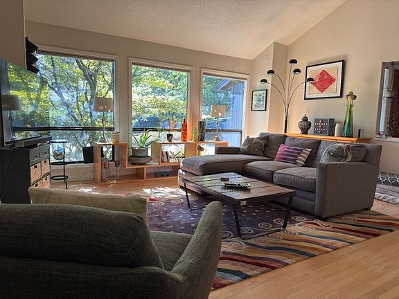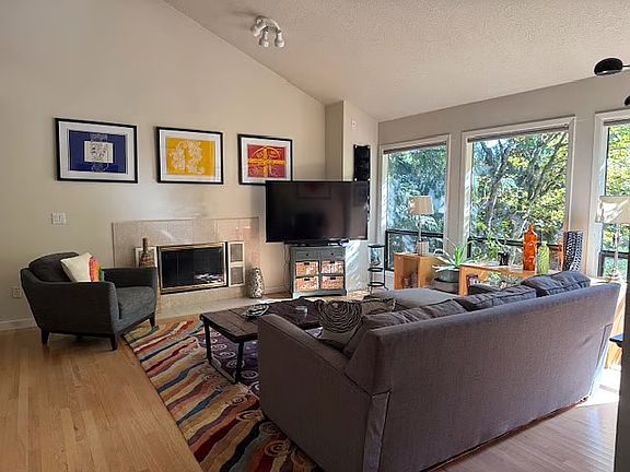 Large home in the quiet and beautiful Stephenson neighborhood of SW Portland, it is nearby to numerous parks including Marshall and Tyron Creek State Park. The house is well situated to downtown Portland, Lake Oswego, OHSU and other hospitals, Nike, and Intel. The comfortable and airy interior comes with hardwood floors and carpet in the bedrooms. The bedrooms and bathrooms span both levels with the Master Suite and large walk in closet/bathroom on the lower level and two upstairs bedrooms and a bathroom (plus a bonus space in the lofted area). On the lower level the high ceiling living room flows into the dining room and kitchen. In the kitchen there is an island for bar height eating, a refrigerator, Bosch dishwasher, stove top, wall oven and microwave, and lots of cabinets for storage. Updated washer and dryer. Off the kitchen sliding glass doors take you to a large back deck with a gas grill and tables. To the side of the house is a yard with a large lawn for the kids or dog to play, year round vegetation and flowers, and opportunity for a garden. The attached garage comes with an electric car charger.