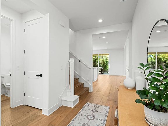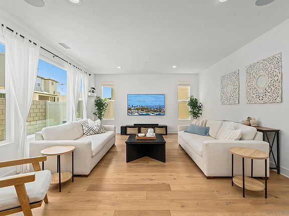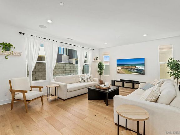 Welcome to Brio at 3Roots, an exceptional 4BR/3.5BA corner-lot home with a rare VA-assumable loan! Recently built, this high-end residence combines sophisticated design, modern comfort, and an unbeatable central location in one of San Diego’s most exciting new master-planned communities. Inside, a bright, open floor plan is enhanced by rich hardwood floors, elegant quartz countertops, and generous counterspace perfect for entertaining. The chef’s kitchen features a built-in refrigerator, gas appliances, and sleek finishes that elevate everyday living. The dining area flows seamlessly into a covered California room with a cozy fireplace, creating the ultimate indoor/outdoor experience. Upstairs, a spacious loft with a custom sliding barn door provides a versatile flex space—ideal as a TV room, playroom, or home office. The luxurious primary suite offers a peaceful retreat, complete with a spa-style soaking tub, dual vanities, and a large walk-in closet. Three additional bedrooms and two full bathrooms ensure comfort for family or guests. Additional highlights include owned solar panels, a newly landscaped backyard with low-maintenance turf, and low HOA fees. Residents of 3Roots enjoy a wealth of resort-style amenities: two sparkling pools, a state-of-the-art fitness center with exercise classes hosted by Fit Athletic, multiple parks and playgrounds, recreation center and more. This turnkey home pairs premium finishes with a vibrant, active lifestyle—perfect for those seeking modern elegance and the best of San Diego living.