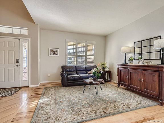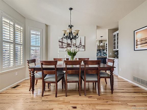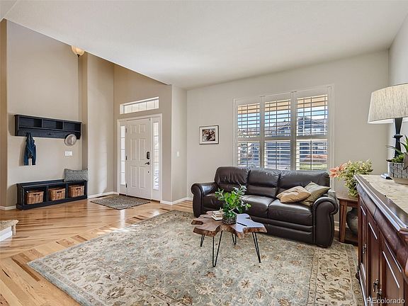 Nestled on a quiet corner lot in Littleton’s coveted Chatfield Farms neighborhood, this 4-bedroom, 4-bathroom home with an attached 3-car garage boasts elegant interiors across over 5,000 total square feet. Enjoy your morning coffee on the picturesque front porch with a view of the mountains in the distance. As you enter the residence, the interiors instantly impress in the foyer with a grand staircase and soaring double-height ceilings. Gorgeous hardwood floors run throughout the first level into the open-concept kitchen and family room with a gas fireplace and wiring for surround sound. The gourmet kitchen is outfitted with stainless steel appliances, including a double oven and a 6-burner stove; custom tile backsplash; Corian countertops; and bar seating. This level is complete with a formal living and dining room, a light-filled office, a bathroom, and a laundry room.