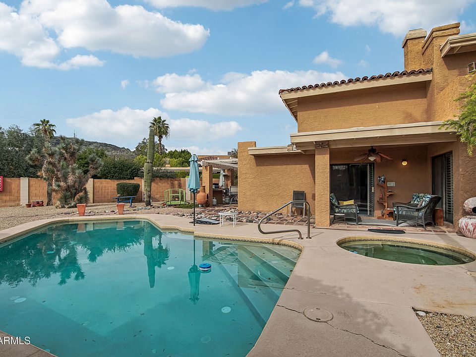 Step outside to a true Arizona backyard oasis, a huge lot designed for relaxing, entertaining, and appreciating mountain views. Enjoy a sparkling diving pool, rejuvenating in-ground spa, mature desert landscaping, iconic saguaro, citrus, shaded sitting areas, and multiple conversation patios.