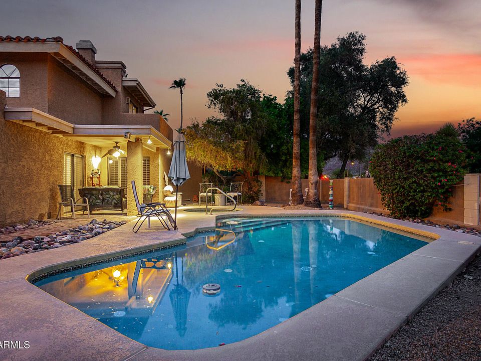 Sparkling poolCovered patioBeehive fireplaceMountain viewsAiry main bedroomPrivate exitWhite cabinetry