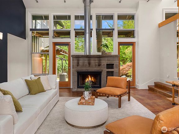 Stunning 4BD/3.5BA contemporary, award-winning home on sought-after Norway Hill, designed by Rhodes Architecture + Light. Light-filled interiors feature radiant concrete floors, soaring ceilings, and walls of windows framing lush surrounding. The updated chef's kitchen includes quartz counters and stainless appliances. Main-level primary suite offers a spa-like bath. Enjoy indoor-outdoor living with multiple patios, a serene courtyard, lush landscaping, and an outdoor wood-burning fireplace. A detached studio with full bath is perfect for guests or office. Three-car garage, 1.48 acres grounds, and privacy - just minutes to I-405 and in the top-rated Northshore School District. An extraordinary blend of modern design and peaceful living.