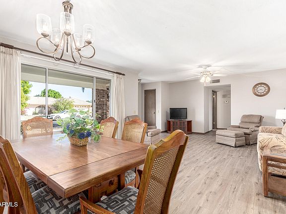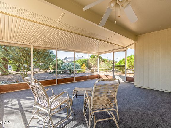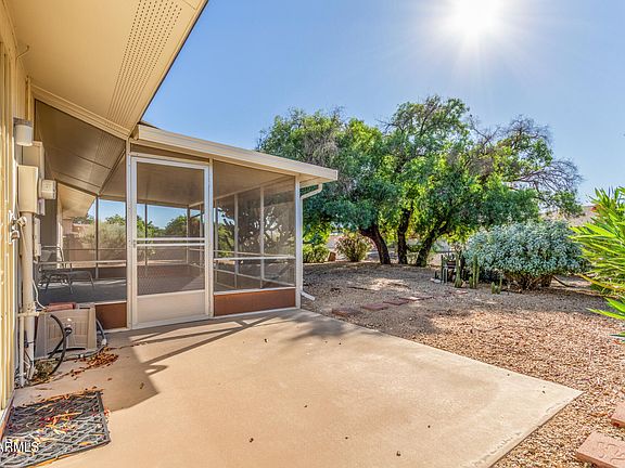 ~ Come enjoy nature looking into a beautiful parklike backyard from your screened-in patio ~ And bring your golf cart too because the spacious garage includes a tandem golf cart parking area!  It has built-in cabinets and its own AC ~ The kitchen has a skylight that illuminates the entire area, and includes butcher block countertops, a convenient breakfast bar, and the freshly painted cabinets bring it all together ~ The open great room is perfect for entertaining! It has a large picture window that also overlooks the backyard ~ 2025 Updates include Roof, Flooring in Dining/Family Room, Kitchen & Bathroom Countertops, Freshly Painted Cabinetry, and Kitchen Wall Oven ~ Interior was painted in 2023 ~ Come experience the Arizona indoor outdoor lifestyle with this home!
