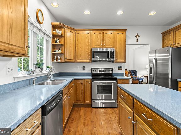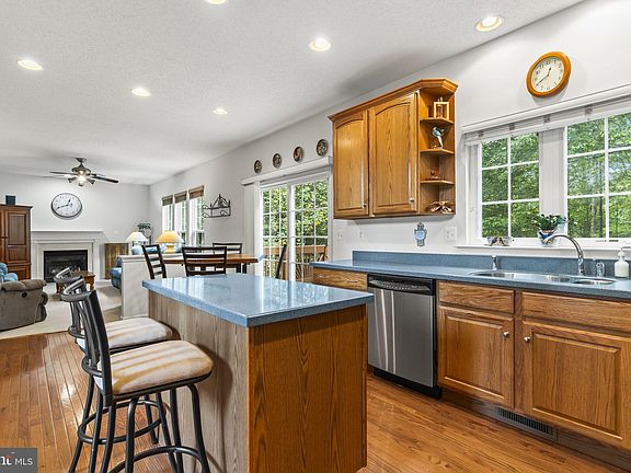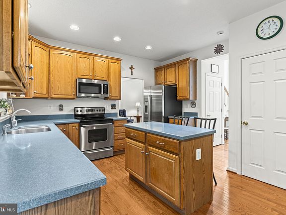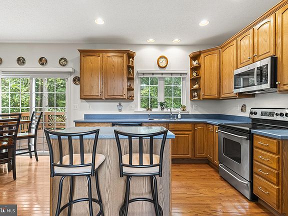 Welcome to this beautiful stone and vinyl front Colonial, set on a private, professionally landscaped .80-acre lot backing to trees. Enjoy outdoor living with a multi-level deck, concrete patio, and spacious backyard that provides both privacy and relaxation. Inside, the main level offers an open-concept design featuring a two-story foyer with hardwood floors, formal living and dining rooms with crown molding, chair rail, and wainscoting, plus a private office with French doors. The island kitchen boasts Corian countertops, 42-inch oak cabinets, stainless steel appliances—including a new refrigerator and above-stove microwave (both less than a year old). recessed lighting, pantry, and a breakfast nook with sliding doors to the deck. The family room, complete with a gas fireplace and marble surround, is filled with natural light and flows seamlessly into the kitchen and breakfast area. Hardwood floors extend through much of the main level, enhanced by 9-foot ceilings. Upstairs, the owner’s suite includes cathedral ceilings, a sitting area, two walk-in closets with organizers, and a spa-like bath with soaking tub, updated shower, double vanity, and private commode. Three additional bedrooms and a full bath complete the upper level. Additional highlights include dual-zone HVAC systems, architectural roof (2017), gutters and shutters (2017), a two-car garage with mudroom entry, and a one-year-old high-efficiency washer and dryer. The unfinished walkout basement with full bath rough-in offers endless potential. This home also comes with a one-year home warranty for peace of mind. Truly a must see!
