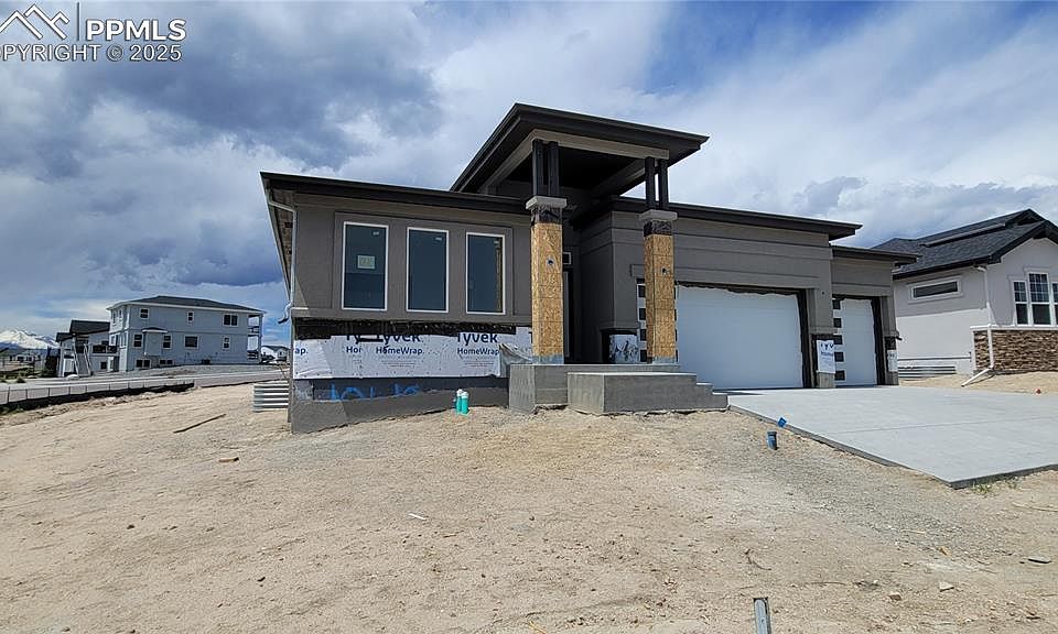 Welcome to the Hillingdon! Situated on a prime corner lot in the highly sought-after Wolf Ranch Community, this beautifully crafted Prairie-style home has the perfect blend of elegance, functionality, and energy efficiency. Enter to a light-filled great room, complete with engineered wood flooring, a cozy gas fireplace, and built-in shelving. The chef-inspired kitchen features sleek quartz countertops, a spacious island with additional seating, a walk-in pantry, and stainless steel appliances, with a gas range, pyramid hood, drawer microwave, and dishwasher. The open-concept dining area flows seamlessly to the back patio, perfect for entertaining or enjoying your morning coffee. Retreat to the luxurious primary suite, complete with a tranquil sitting room, a spa-like 5-piece bathroom, and a generous walk-in closet. A versatile secondary bedroom or home office, a full bath, and a conveniently located laundry room complete the main level. The finished basement with 9' ceilings expands your living space with a large family room, wet bar rough-in, two additional bedrooms, a full bathroom with linen closet, and an expansive utility/storage room. This home is built for efficiency and sustainability with features such as a tankless water heater, 96% efficient furnace with variable speed motor, sealed ductwork, PEX plumbing, and an active radon mitigation system—all contributing to an impressive energy score rating.