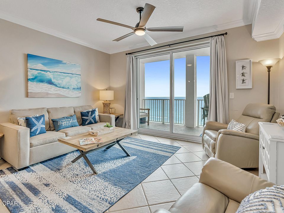 This 3BR/3BA gulf-front condo at Ocean Ritz combines space, comfort, and incredible views in a mid-size building with only 63 residences - just three per floor - meaning more privacy, fewer crowds, and plenty of room to enjoy the beach. The open living, dining, and kitchen area flow seamlessly together, framed by 9' ceilings and wall-to-wall glass doors that open to a massive 270 sq ft bowed balcony spanning the full width of the unit, showcasing an unobstructed view down the entire coastline. Ceramic tile flooring throughout adds easy maintenance, while the kitchen features granite counters, stainless steel appliances, and an inviting breakfast bar. Each bedroom has its own flat-screen TV and private bath, with the master suite offering balcony access and a king bed where you can wake up to emerald-green waters right outside. A deeded parking space makes life and rentals effortless. With resort amenities including a beachfront heated pool, hot tub, fitness center, sauna, and BBQ area - all set in beautifully landscaped surroundings - you'll love the balance of luxury and relaxation. Perfect as a vacation getaway or a strong-performing rental, this condo puts you minutes from Pier Park, Shipwreck Island, TopGolf, and the best dining in Panama City Beach. See why life is better with a little ritz - schedule your private tour today.