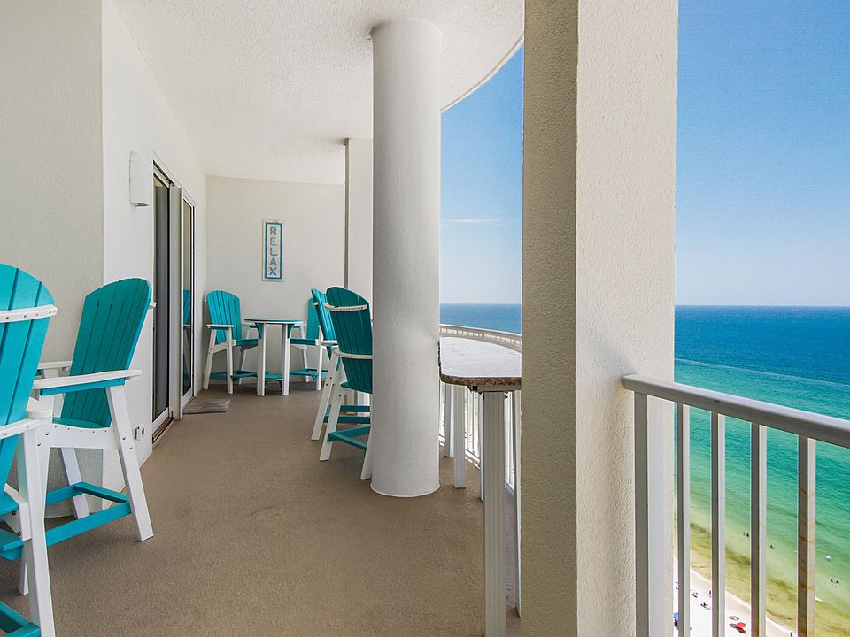 RENOVATED TURNKEY PENTHOUSE ready for your enjoyment. Penthouse was used primarily for owner use which makes it Pristine. Pride of Ownership throughout! This Condo pops with Bright Teal Blue colors, Upscale light-colored furniture, rewired for extra peace of mind, new modern ceiling fans and Beachy decor to match. Title flooring throughout the unit for easy maintenance. Ocean Ritz only has three units per floor so no heavy traffic flow. Master bedroom not only has majestic Gulf views but has balcony access as well as the living room. This beautiful Penthouse boasts 10'ceilings with crown molding, granite countertops, stainless steel appliances, newer stacked washer/dryer (2022) and a dry bar and wine cooler. Water Heater and Dishwasher also installed in 2022. Also find custom granite countertop added to large 300 ft open balcony, a dedicated parking space, parking garage access and extra parking across the street. The complex has a fitness room, seasonably heated pool, whirlpool and spa & BBQ area. Elevator is fast and efficient; Penthouse located right off elevator for easy unloading of groceries and beach equipment. Golfing, multiple restaurants, water parks just minutes away. Pier Park just a few short miles away this is a great location! Schedule Your own private viewing today! Buyer and buyer's agent to verify all dimensions and anything deemed important.