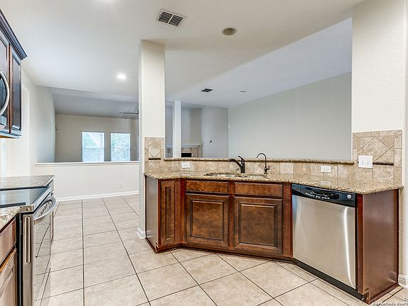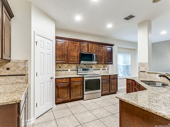 In the desirable gated community of Triana, this gorgeous 6-bedroom, 4-bath home offers a spacious and versatile layout, nestled on a quiet cul-de-sac and backing to a greenbelt with no rear neighbors for added privacy. Fresh Paint! Step inside to find tall ceilings, an open floor plan, and a flex space perfect for a formal dining room or dedicated home office. Granite countertops, stainless steel appliances, stone accents, and a breakfast bar in the kitchen, overlooking the main living space with a cozy fireplace. The main level features a guest suite along with a luxurious primary suite with a double vanity, walk-in shower, garden tub, and a spacious walk-in closet. Upstairs, enjoy a media room perfect for movie nights, a large game room that could easily serve as a 7th bedroom. Outside, relax under the covered patio overlooking the private backyard oasis. Additional highlights include newer HVAC, solar screens, and water softener. Located in the NISD school district, this home is just minutes from shopping, dining, and major highways, making it a perfect blend of luxury and convenience. Don't miss your opportunity to own this exceptional home!