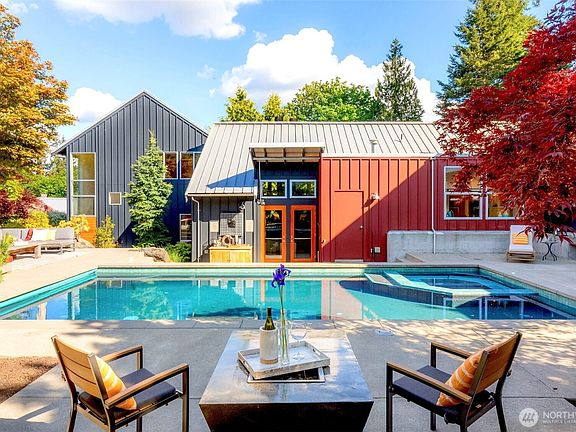 Exceptional 4BD/4BA modern home on coveted Norway Hill, designed by award-winning Rhodes Architecture + Light. Open floor concept, light-filled interiors feature radiant concrete floors, soaring ceilings, and expansive windows. Remodeled chef’s kitchen with quartz counters, SS appliances, and 6-burner gas cooktop. Main-level primary suite with spa-like en-suite. Seamless indoor-outdoor living includes heated pool and hot-tub with safety cover, cascading fountain, sunlit courtyard, patios, lush gardens, and outdoor wood fireplace. Separate studio with full bath for guest space or home office. 3-car garage. Private setting on acreage with mature landscaping. Northshore Schools. Easy access to I-405. A rare architectural gem and private oasis.