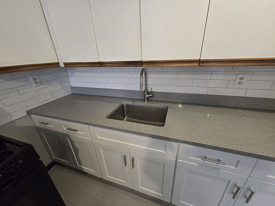 Newly-renovated kitchen featuring modern cabinetry, quartz countertops, and elegant stone-tile flooring