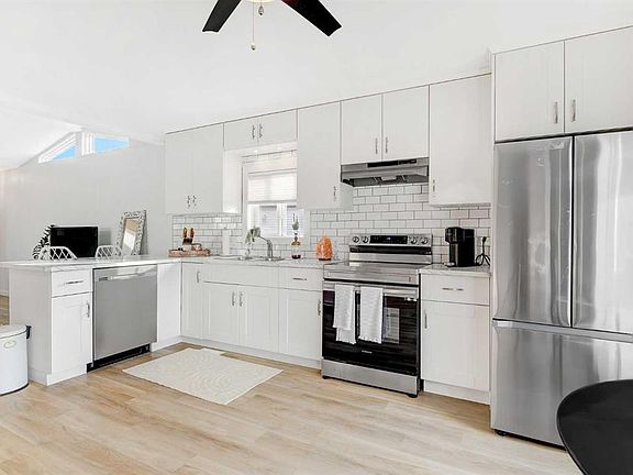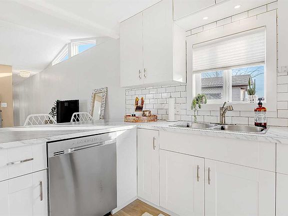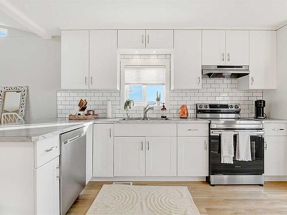 Gorgeous bright kitchenBig windowsCrisp white cabinetsSubway tile back splashStainless appliancesFenced in area