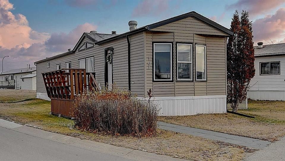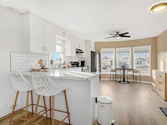Beautifully renovated home in Trumpeter Village!! Gorgeous bright kitchen with big windows, crisp white cabinets, subway tile back splash and stainless appliances. Living room with vaulted ceilings, 3 bedrooms and 4 pc main bath. Vinyl plank flooring through out. The property includes a deck, shed and fenced in area. Lot rent is $584/month. Call today!